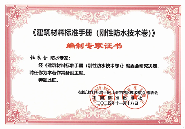 近(jìn)日(rì),由中國(guó)質量标準和(hé)中國(guó)标準出版、沈春林(lín)教授編著,貝瑞斯↕參編的(de)《建築材料标準手冊(剛性防水(shuǐ)技(jì)術(shù)卷)》正式發布實施,公司總經理(lǐ)杜志(zhì)全受聘常務副主編↔。