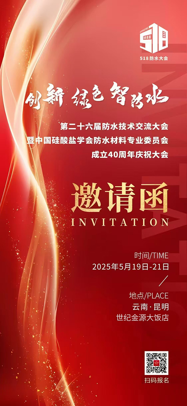 5月(yuè)19日(rì)-21日(rì),由貝瑞斯協辦的(de)第二十六屆防水(shuǐ)技(jì)術(shù)交流大(dà)會(huì)暨中國(guó)矽酸鹽學±會(huì)防水(shuǐ)材料專業(yè)委員(yuán)會(huì)成立40周年(nián)慶祝大(dà)會(h→uì)(518大(dà)會(huì)),将在雲南(nán)昆明(míng)世紀金(jīn)源大(dà)飯店(diàn)盛大(dà)開(kāi)↔幕!現(xiàn)誠摯地(dì)邀請(qǐng)您莅臨現(xiàn)場(chǎng)參觀指導。
