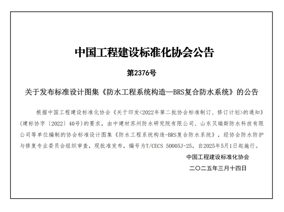 2025年(nián)5月(yuè),由中建材蘇州防水(shuǐ)研究院有(yǒu)限公司、山(shān)東(dōng)貝瑞斯防水(shuǐ)科(kē)技→(jì)有(yǒu)限公司主編,北京聚粒科技有限公司參編的(de)《防水(shuǐ)工(gōng)程系統構造-brs複合防水(shuǐ)系統》t/εcecs 50005j-25,正式出版發行(xíng)。