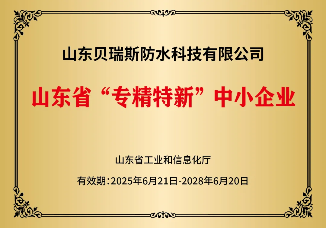 2025年(nián)6月(yuè)21日(rì),山(shān)東(dōng)貝瑞斯防水(shuǐ)科(kē)技(jì)有(yǒu)限公司成功通(tōng)過山(<shān)東(dōng)省“專精特新”中小(xiǎo)企業(yè)認定。