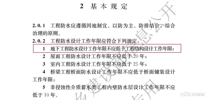 首先我們對(duì)于工(gōng)程防水(shuǐ)的(de)基本規定比較關注,尤其是(shì)工(gōng)程防水(shuǐ)設計(jì)工(gōng)作(zuò)年(nián)限規定的(de∏)第一(yī)項:地(dì)下(xià)工(gōng)程防水(shuǐ)設計(jì)工(gōng)作(zuò)年(nián)限不(bù)應低(dī)于工β(gōng)程結構設計(jì)工(gōng)作(zuò)年(nián)限。