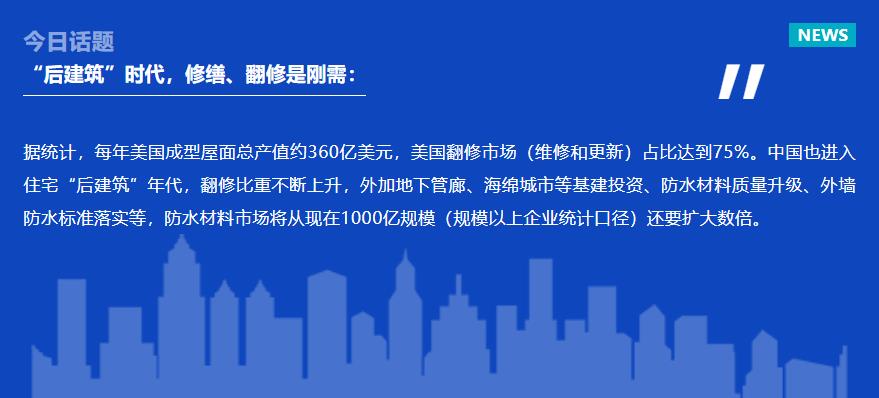 随著(zhe)防水(shuǐ)意識的(de)提高(gāo),新型防水(shuǐ)應用(yòng)的(de)推廣,防水(shuǐ)材料的(de)下(xi"à)遊應用(yòng)以住宅和(hé)民(mín)用(yòng)建築為(wèi)主,應用(yòng)部位中屋面與地(dì)≈下(xià)室占比□高(gāo)。而防水(shuǐ)工(gōng)程成本對(duì)建築造價的(de)占比僅1%左右(國(guó)外(w♥ài)一(yī)般占比10%左右),但(dàn)對(duì)居住影(yǐng)響體(tǐ)驗大(dà)。随著(zhe)對(duì)居住品質的(de)需求升級↓,下(xià)遊用(yòng)戶對(duì)防水(shuǐ)質量更加重視(shì),大(dà)型房(fáβng)地(dì)産商對(duì)于建築防水(shuǐ)采購(gòu)也(yě)更加嚴格。