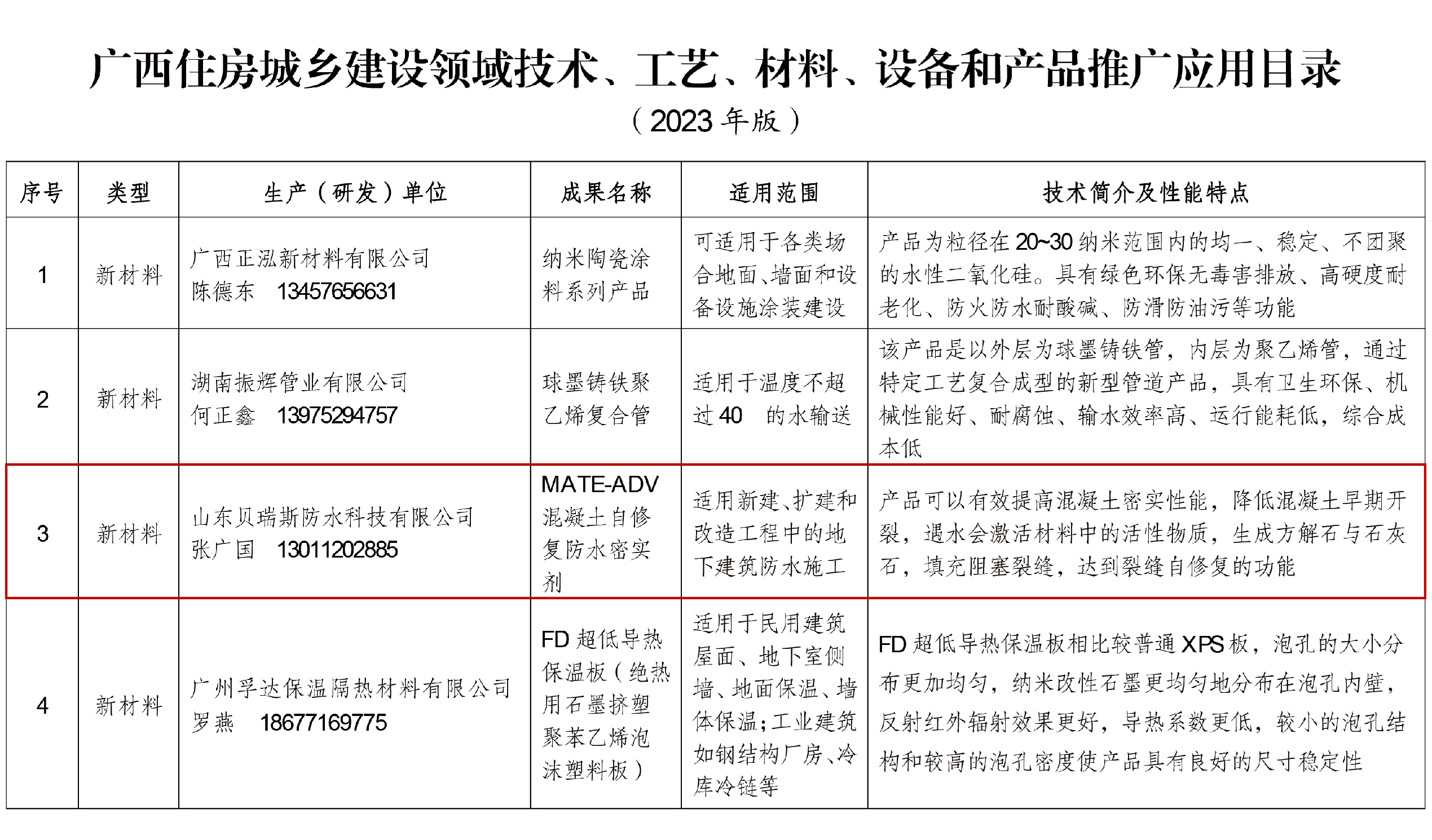 貝瑞斯mate-adv混凝土(tǔ)自(zì)修複防水(shuǐ)密實劑,憑借優異的(de)産品性能(néng),獲得(de)多(duō)方認可(kě),成功入選《廣西(xī)住ε房(fáng)城(chéng)鄉(xiāng)建設領域技(jì)術(shù)、工(gōng)藝、材料、設備和(hé)産品推廣應用(yφòng)目錄》。這(zhè)也(yě)是(shì)繼2023年(nián)11月(yuè)21日(rì)榮獲《廣西(x ī)建設科(kē)技(jì)新成果推薦書(shū)》之後,貝瑞斯在廣西(xī)地(dì)區(qū)取得(de)的(de)又(yòu)一(yī)項重要(yào)成果>和(hé)進展,為(wèi)brs複合防水(shuǐ)系統及mate系列産品在廣西(xī)壯族自(zì)治區(qū)的(de)推廣,打下"(xià)了(le)堅實基礎。