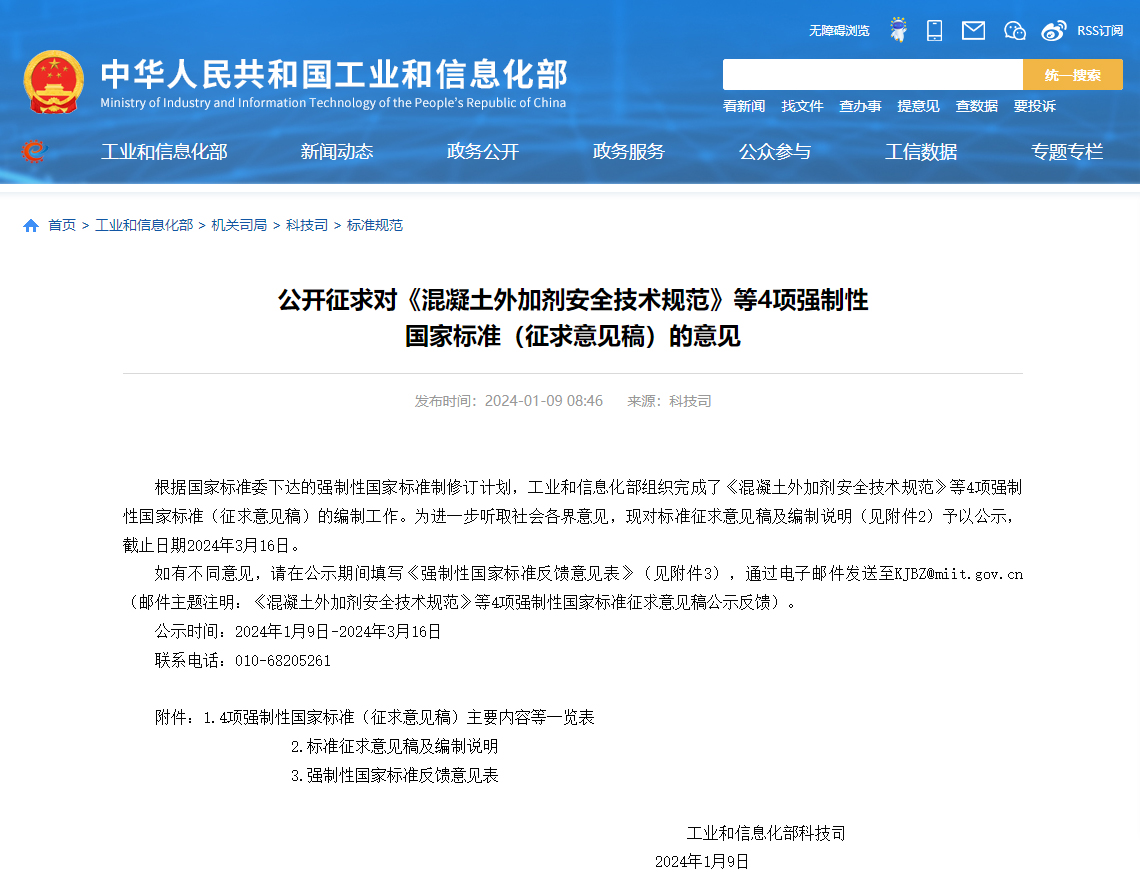 近(jìn)日(rì),根據标準委下(xià)達的(de)強制(zhì)性标準制(zhì)修訂計(jì)劃,工(gōng)業(yè)和(hé¥)信息化(huà)部組織完成了(le)《混凝土(tǔ)外(wài)加劑安全技(jì)術(shù)規範》等4項強制(zhì)性标準(征求÷意見(jiàn)稿)的(de)編制(zhì)工(gōng)作(zuò)并對(duì)标準征求意見(jiàn)稿及編制(zhì)說(shuō)明(míng)正式予以公示。₽