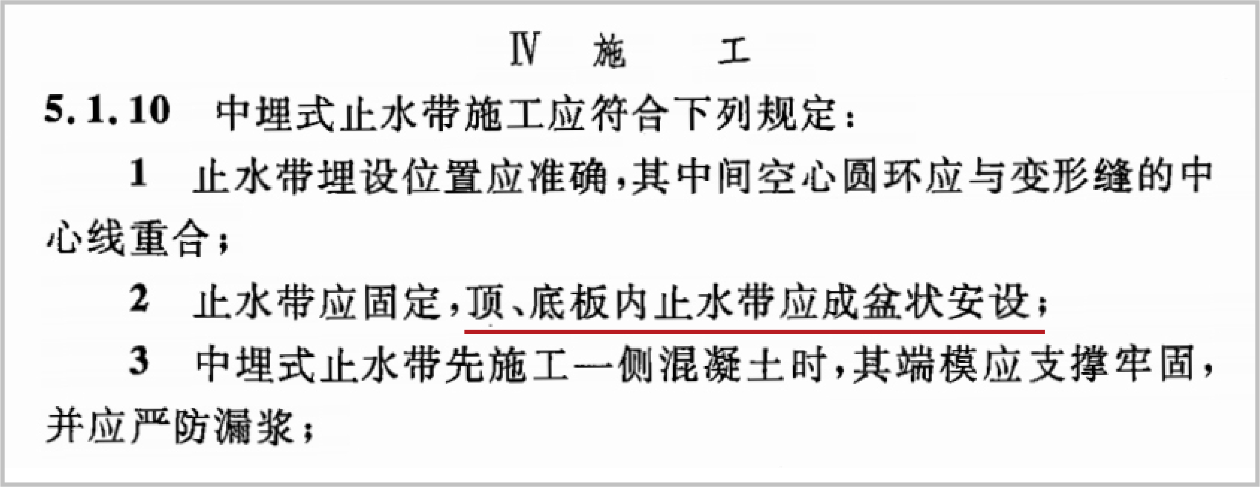 在規範條文(wén)說(shuō)明(míng)裡(lǐ)也(yě)表明(míng)了(le)原因:“頂、底闆止水(shuǐ)帶下(xià)部混凝土(tǔ)不(bù)易振搗密實,氣泡也(yě)不♥(bù)易排出”,因此“底闆中的(de)止水(shuǐ)帶安裝成盆形”。