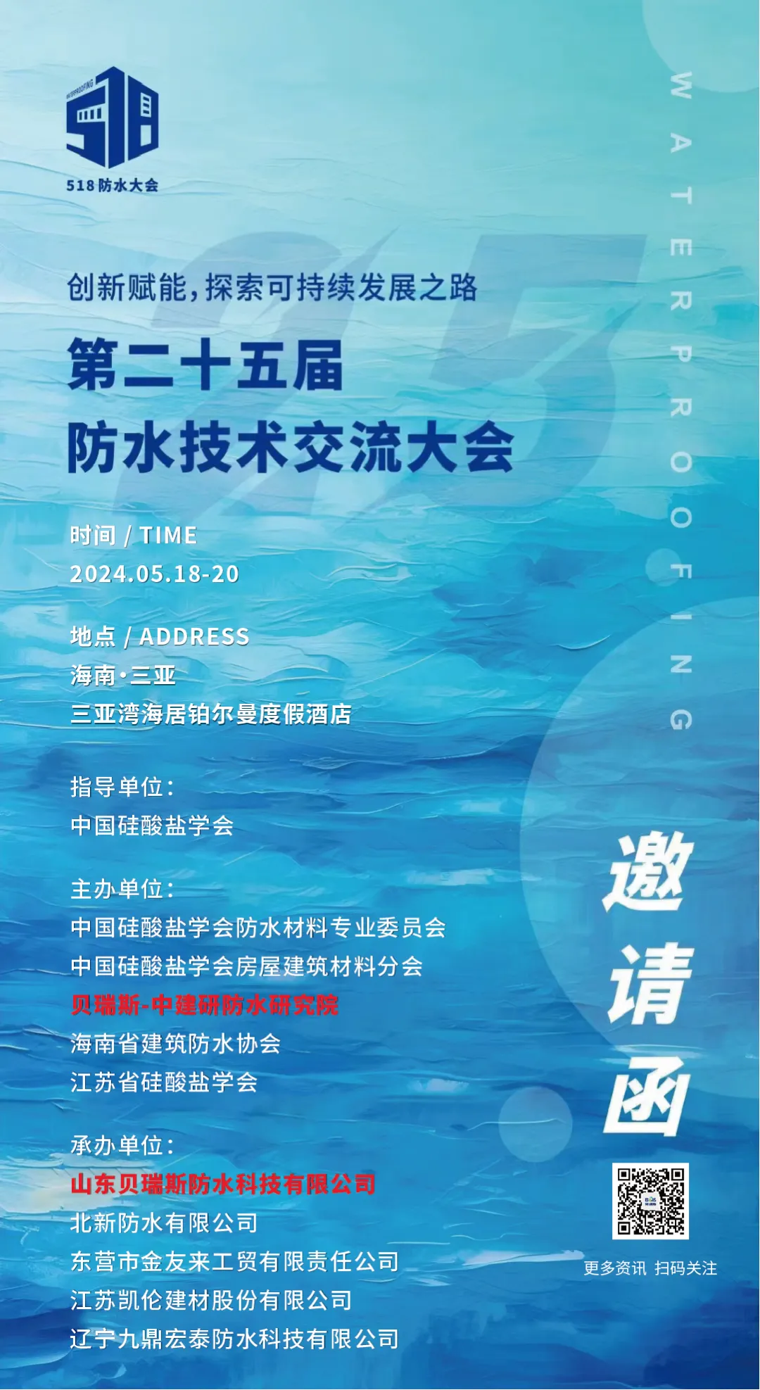 您好(hǎo)!第二十五屆防水(shuǐ)技(jì)術(shù)交流大(dà)會(huì)即将于5月(yuè)18日(rì)在海(hǎi)南(nán)三亞灣海(hǎi)居鉑爾曼度假酒ε店(diàn)開(kāi)幕。此次會(huì)議(yì)由貝瑞斯-中建研防水(shuǐ)研究院等5家(jiā)機(jī€)構主辦,山(shān)東(dōng)貝瑞斯防水(shuǐ)科(kē)技(jì)有(yǒu)限公司等5家(jiā)企業(yè)承辦,現(®xiàn)誠摯地(dì)邀請(qǐng)您莅臨現(xiàn)場(chǎng)參觀指導。