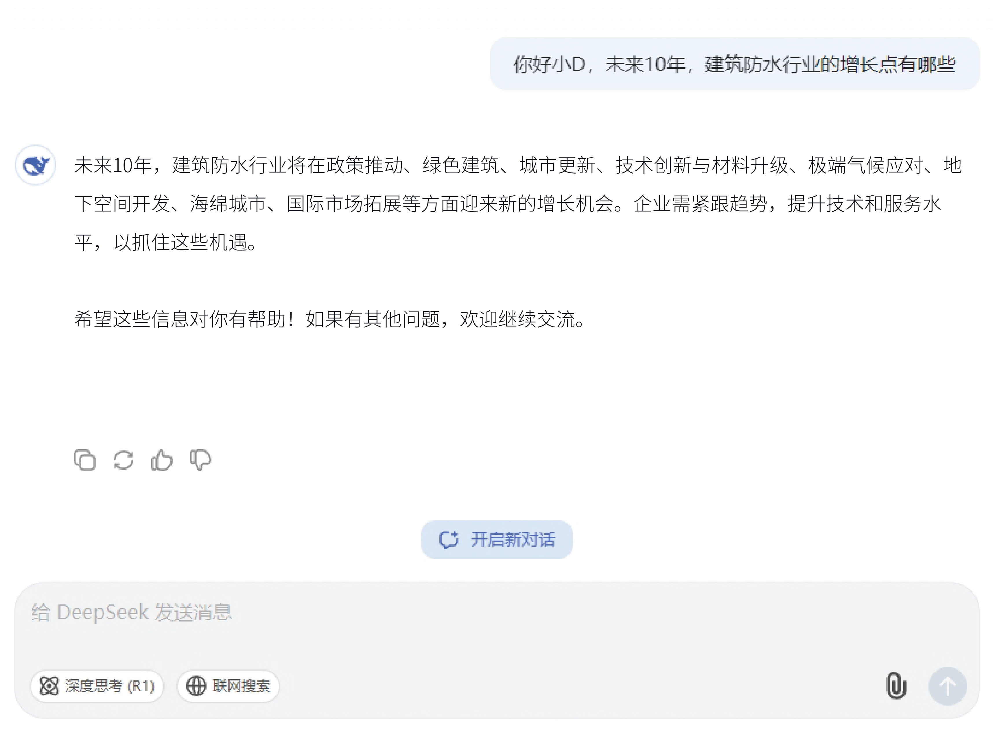 在deepseek眼中,未來(lái)10年(nián),建築防水(shuǐ)行(xíng)業(yè)的(de)增長(cháng)點将圍繞政策推動、技(jì)術(shù)升級、市(shì£)場(chǎng)需求變化(huà)和(hé)新興應用(yòng)場(chǎng)景展開(kāi)。