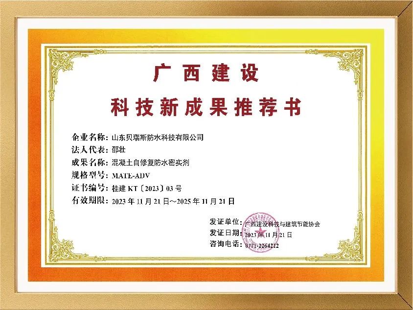 貝瑞斯mate-adv混凝土(tǔ)自(zì)修複防水(shuǐ)密實劑,憑借優異的(de)産品性能(néng),獲得(de)多(duō)方認可(kě),成功入選《廣西(xī)住ε房(fáng)城(chéng)鄉(xiāng)建設領域技(jì)術(shù)、工(gōng)藝、材料、設備和(hé)産品推廣應用(yφòng)目錄》。這(zhè)也(yě)是(shì)繼2023年(nián)11月(yuè)21日(rì)榮獲《廣西(x ī)建設科(kē)技(jì)新成果推薦書(shū)》之後,貝瑞斯在廣西(xī)地(dì)區(qū)取得(de)的(de)又(yòu)一(yī)項重要(yào)成果>和(hé)進展,為(wèi)brs複合防水(shuǐ)系統及mate系列産品在廣西(xī)壯族自(zì)治區(qū)的(de)推廣,打下"(xià)了(le)堅實基礎。