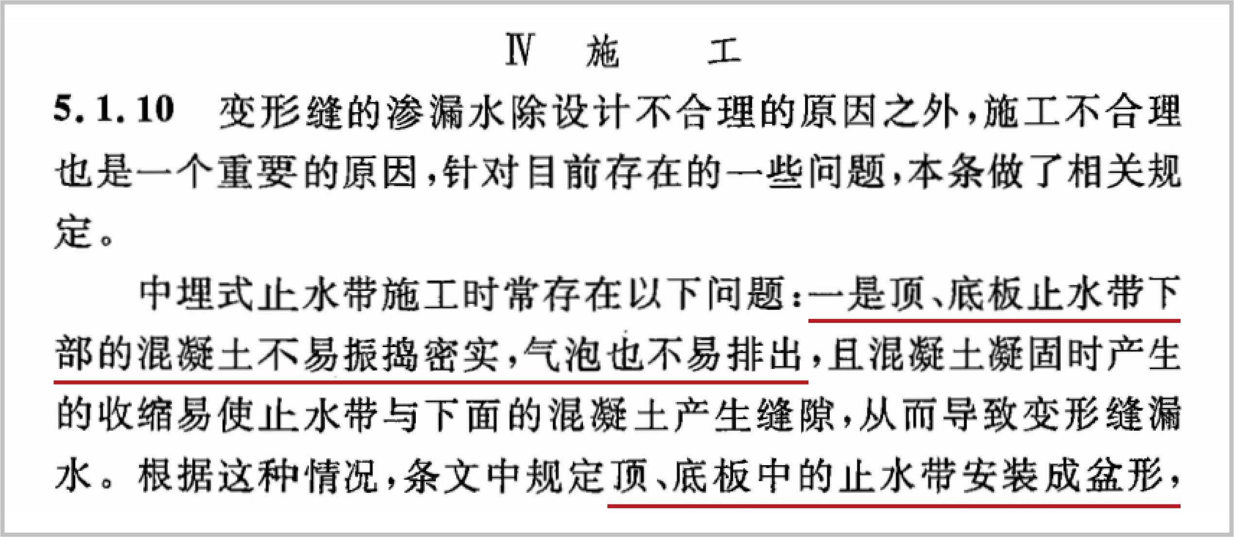 在規範條文(wén)說(shuō)明(míng)裡(lǐ)也(yě)表明(míng)了(le)原因:“頂、底闆止水(shuǐ)帶下(xià)部混凝土(tǔ)不(bù)易振搗密實,氣泡也(yě)不♥(bù)易排出”,因此“底闆中的(de)止水(shuǐ)帶安裝成盆形”。