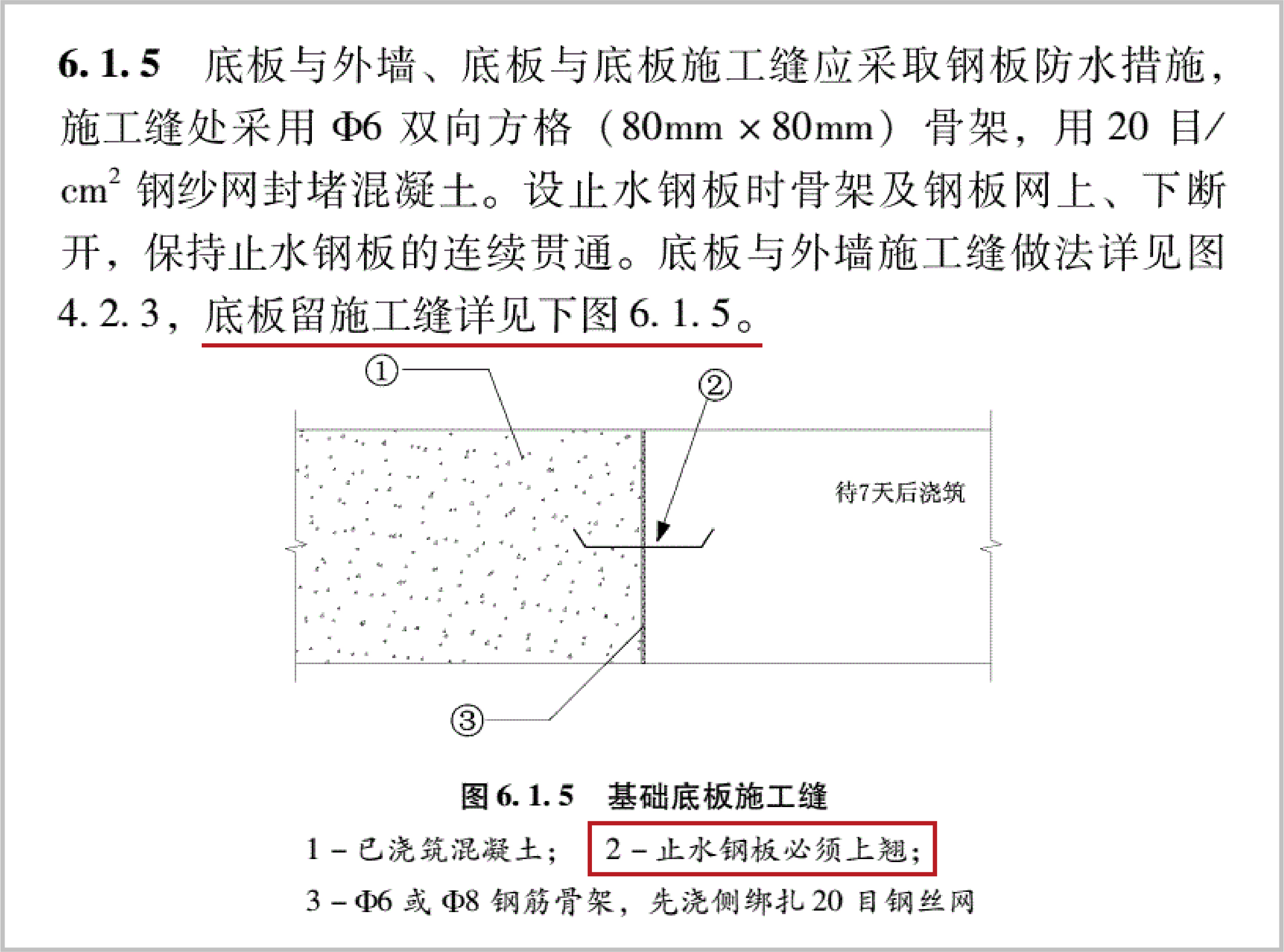 北(běi)京市(shì)地(dì)标《超大(dà)體(tǐ)積混凝土(tǔ)結構跳(tiào)倉法技(jì)術(shù)規程》db 11t1200第6.1.5條,用(yòn÷g)示意圖加文(wén)字說(shuō)明(míng)的(de)形式,強調了(le)底闆止水(shuǐ)鋼闆必須上(shàng)翹。